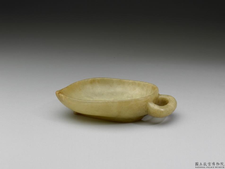 玉质,玉色泛黄,有璺。器身呈桃实形,浅腹、圈足,尾端带环耳把。