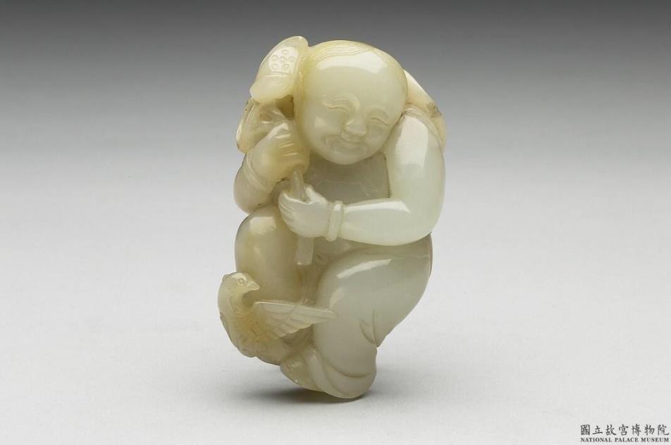 玉质,有黄赭烤斑。全器为一站立童子,手持荷叶莲蓬,展开的荷叶延伸至童子身后。右脚抬起,前方有一展翅小鸟。童子手持象征多子的莲蓬,更加强多子多孙的吉祥意义。