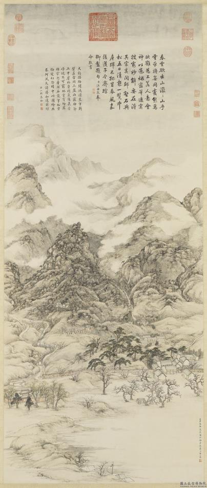 春云欲出山蒙蒙。山乎云乎将无同。变态万状难为工。若人意会神以通。烟峦莫遁冥搜穷。妙解要在得其宗。奚问邱壑石与松。五日清游一览中。扈跸不孤冐春风。嘉陵道子今齐踪。御制题句。臣汪由敦奉命敬书。