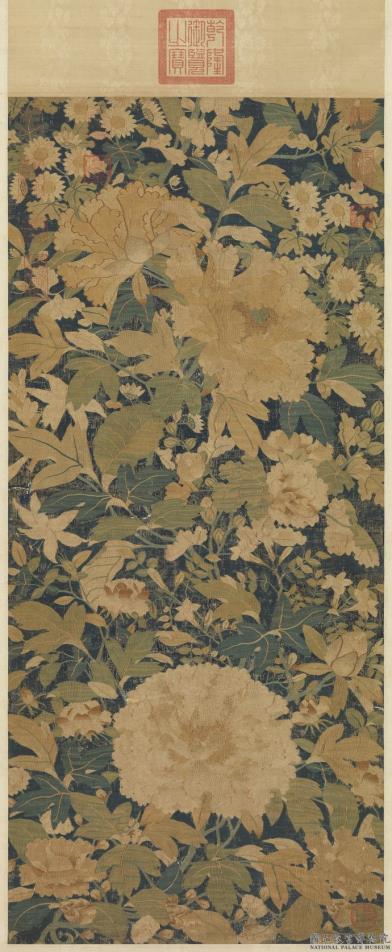 此幅以娇艳盛开的牡丹为主体,蔷薇、菊花、芙蓉陪衬其间,花蕊繁复,枝叶交错,色彩鲜丽明亮,画面充实,极富装饰效果。月季或称为蔷薇、长春花,与牡丹组合成寓意吉祥的「富贵长春」。