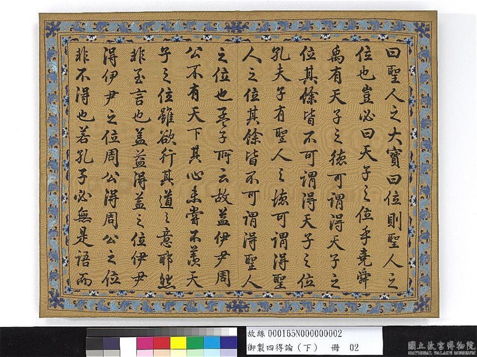 (缂丝御制四得论(下))。四得续论。近作四得之论。非自谦也。盖纪身之鲜实德。与已之所实见耳。然尚有未尽意者。前论切乎已。续论公天下。抑亦有所独重者耳。盖中庸第十七章子曰。至子孙保之而止。所以戒为天子者。保其位而已。此皆夫子之言。其下四得之绎。则皆子思之语。非夫子之语也。以位言之易。曰君子思不出其位。则君子之位也。又曰。圣人之大宝曰位。则圣人之位也。岂必曰天子之位乎。尧舜禹有天子之德。可谓得天子之位。其余皆不可谓得天子之位。孔夫子有圣人之德。可谓得圣人之位。其余皆不可谓得圣人之位也。孟子所云。故益伊尹周公不有天下。其心未尝不羡天子之位。虽欲行其道之意耶。然非至言也。盖益得益之位。伊尹得伊尹之位。周公得周公之位。非不得也。若孔子必无是语。而朱子注子思此章。直以为必受命为天子。是亦孟子之遗意耳。予以为后世之乱臣贼子。未必非此言。有以启之。然此言非予言之。他人不敢言也。且自古至今。无一代无天子。是皆得其位者乎。予不敢以得位自居。实因德不胜而滋惧耳。至于禄。则自天子以至百辟卿士皆食禄者也。尽其职乃可谓之得。鳏厥官不可谓之得。而其本均不出于修德也。王禹偁待漏院之记。微见其端矣。若夫名乃实之宾。实者德之谓也。无其实而有其名。不滋愧乎。三代以下。惟恐不好名。予谓此语亦未臻而清流。操室中之戈者。非因名有以害之乎。寿则秉来之气数所不可强盗跖寿。而颜渊夭盗。跖果得寿乎。颜渊果不得寿乎。古来尽节以终者。谓之不能得保其寿可乎。兹故申而论之。以戒后世之不务。修其德而徒慕四得。以反致败其德。且以靖天下。后世之托圣贤之书。以妄兴其欲有所得之位之心。有位与无位之人。可不深思所以自处哉。乾隆庚戌(公元一七九○年)仲秋御笔。作是论时。引用系辞。圣人之大宝曰位。盖亦断章取义耳。予之意则以天子有天子之位。圣人有圣人之位。分而言之。然亦非始予意也。盖中庸上节。孔子之言德为圣人。尊为天子已。区而二之矣。既而思之。繋辞本文下即继以。何以守位。曰仁。何以聚人。曰财。理财正辞。禁民为非。曰义。是则天子之事也。似繋辞所指圣人。即天子也。然按诸经从无尊。当时天子为圣人。如后代所称圣君。圣主。圣上者。大禹谟乃圣乃神。为益对舜。称尧之辞微。子之命克齐圣广渊。为成王对微子称汤之词。皆非称当时天子也。三代上君臣之际。情亲而语。质无取乎。颂语惟庄子华封人祝尧。使圣人寿。使圣人富。使圣人多男子。为当时语尧。固圣人也。然则称天子为圣人。起于周秦之间。亦如朕之字专为天子自称。乃昉自秦也。十翼为孔子作不应繋辞有是语。且上繋第十一章。莫大乎富贵。莫大乎圣人。又分着矣。欧阳修以择之不精。繁衍丛脞。近于战国后语。疑十翼为杂取后世讲师之说。非孔子所作亦不为无见。论成偶思及此并按于后。御笔。(缂印四)。八征耄念(重一)。自强不息(重一)。