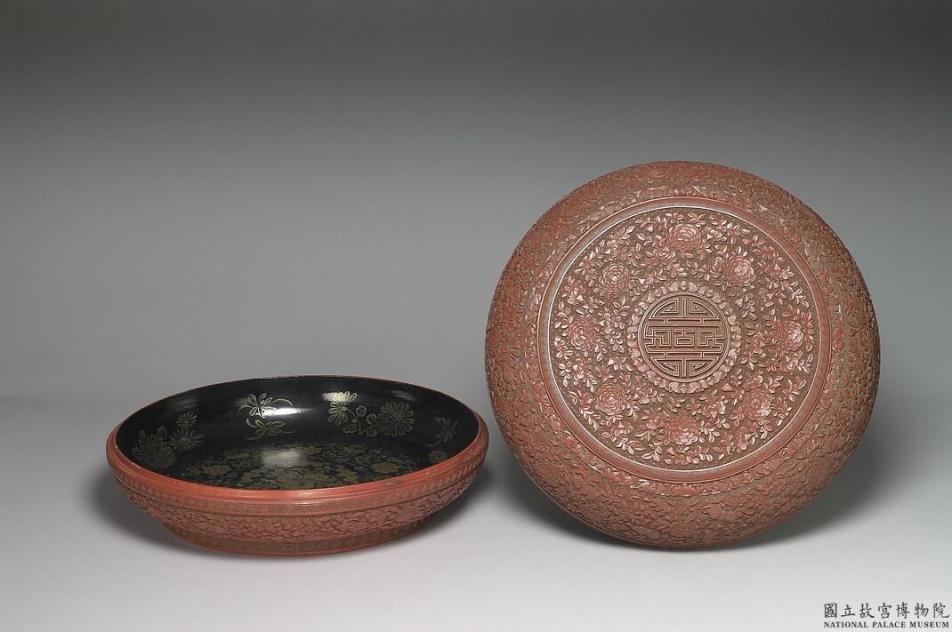 剔红圆盒,色朱红。子母口,弧形壁,圈足。盖面以回纹蝙蝠各一圈为界,雕连枝牡丹花,中作团寿字,盖与器侧面饰连枝牡丹间蝙蝠,呈现富贵气象,器内髹黑色光漆,并描金绘多样花卉与桃实、蝙蝠。