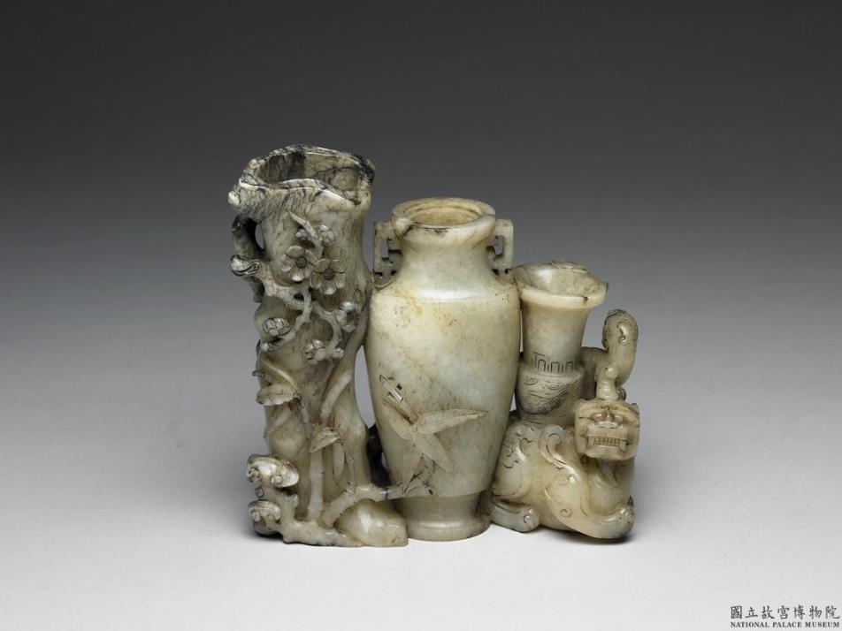 玉质。全器分为三部分。中央为扁瓶,侈口,宽肩,敛腹,双耳,高圈足。瓶左侧琢连树干一段,树干表面浮雕琢绕以竹子、松树、梅枝、灵芝、蝙蝠等物象。瓶左侧则琢连独角兽尊,独角怪兽势作蹲伏,上直立饕餮面尊。瓶圈足底有「乾隆年制」四字篆款。