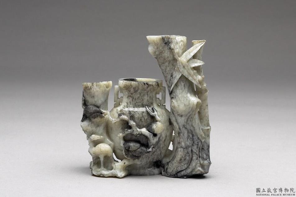 玉质,有黑斑,器身琢有梅根、松树根,及瓶各一梅与松根亦挖成空为容器,周围琢饰有鹿、灵芝、竹叶、梅花、鹤及松树等纹饰,瓶底刻有「乾隆年制」篆款四字。
