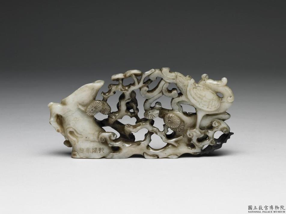 玉质,有黑斑。全器作一枝叶茂盛松树,镂雕枝叶、灵芝,树干挖空为容器,另一侧立雕一凤鸟作回首状。松干上琢有「乾隆年制」四字篆款。