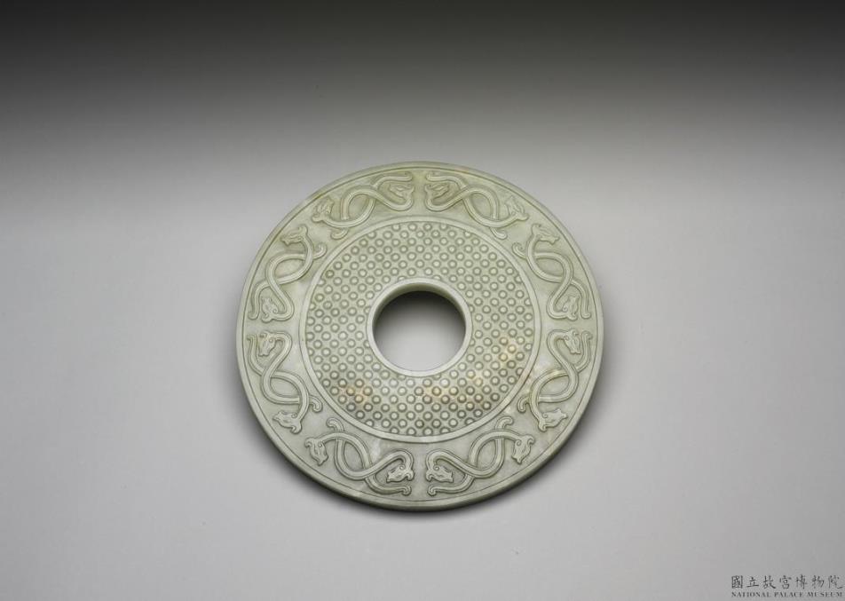 孔壁刻有「乾隆年制」款。双面均有纹饰,作环状的分布:内环为乳丁纹,外环则为八组交缠、简化的龙纹。相邻的两组交龙纹,采左右对称的形式。