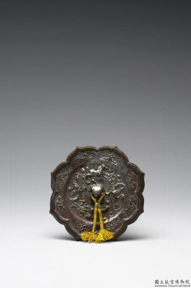 圆镜,作八瓣菱花形、兽形钮。镜背有两飞鸟与兽,间饰卷云,镜缘上则有蝴蝶花枝与卷草间隔排列。