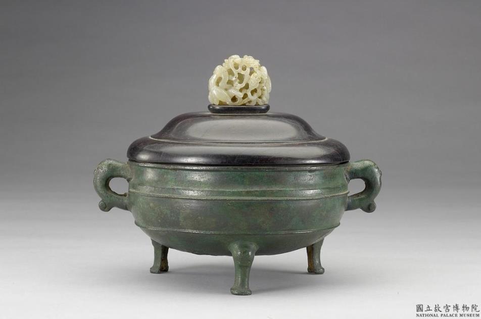 盘口,兽形耳,深腹,蹄足,附玉顶木盖。腹饰弦纹。