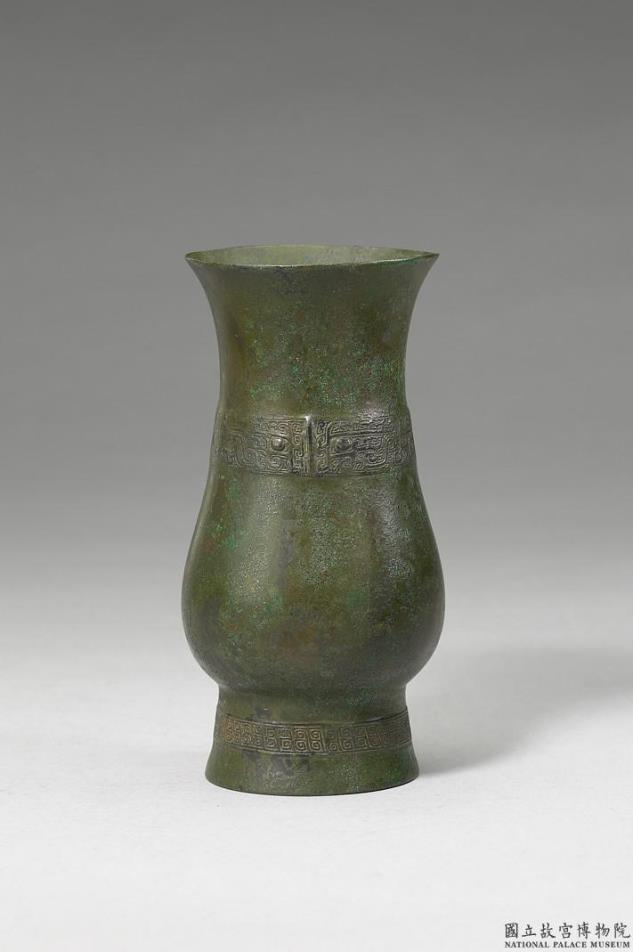 侈口,鼓腹,圈足。颈饰兽面纹,以雷纹为地,足饰云雷纹。