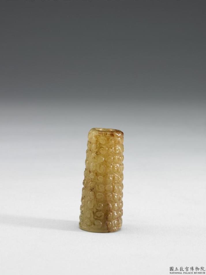 玉质,带浓淡不一的黄斑。圆𤨕,属装饰品类。圆柱形,一端宽、一端窄,中心贯通,周身饰以榖纹。