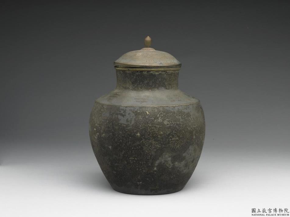 银圆罐,满身锈斑。附钮盖,平底盖饰有云纹,颈部满布菱格纹,肩饰八卦纹,腹部则刻有双龙戏珠及云纹仙山及波涛纹,盖与腹皆以敲打的圆点为地。