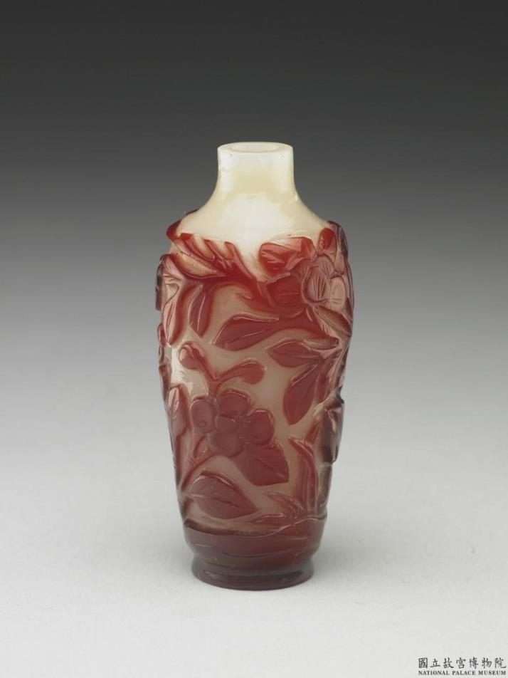 玻璃,通体白色半透明,套以红料纹饰。器作长圆形小瓶,平口,短颈,丰肩,深腹,有套料色圈足。器身雕松石与花卉,花朵与枝叶茂盛,无盖。