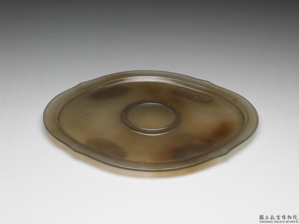玛瑙,器薄呈半透明。全器作圆方形,平沿、平底、四足,口沿四边缘微有尖突,足阴刻云头纹。内底心突起一圆盘,内凹用以承杯。外底心琢「乾隆年制」二行四字隶款。与玉杯(故杂355)为一组。