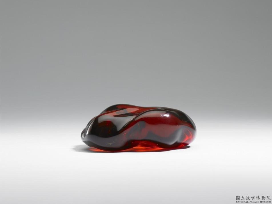 琥珀质,色泽鲜红透亮,作不规则扁圆形。上有一凹槽,为置笔之用。