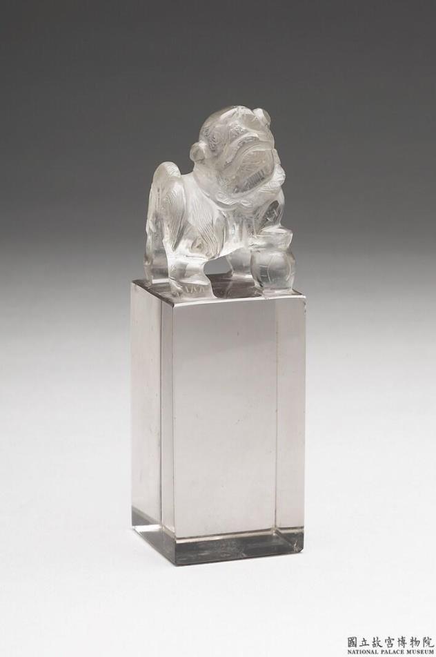 水晶,透明清澈,印身微似茶晶。印钮为一立雕狮子,瞠目咧嘴,头顶光滑,下颔有卷毛纹饰,兽身与尾作微卷长毛状,右前足踏一球,印面未刻。
