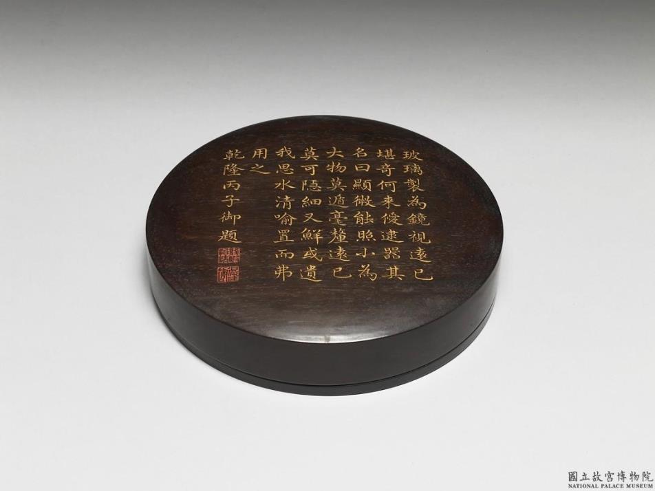 深棕色圆形木盒,带盖,底平。全器光素无纹。盖上刻填金楷书御制诗文「玻璃制为镜,视远已堪奇。何来僾逮器,其名曰显微。能照小为大,物莫遁毫厘,远已莫可隐,细又鲜或遗。我思水清喻,置而弗用之。乾隆丙子(二十一年,1756)御题」。带两方填红减地阳文印「几暇怡情」、「得佳趣」。