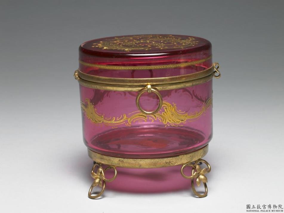 桃红色玻璃圆盒一组(故杂467-故杂470),呈束口椭圆腹与直壁两种形式。口沿镶金属扣,与平顶盖相连,底部镶金边及三足。椭圆盒顶盖内托镶玻璃镜一方,可供旋转照容。盒外壁以描金、白色珐琅彩绘花叶串饰。直壁盒盖顶与外壁以金彩绘饰环状飞羽纹饰。口沿周边各饰以金底白色草叶纹与金色双环。