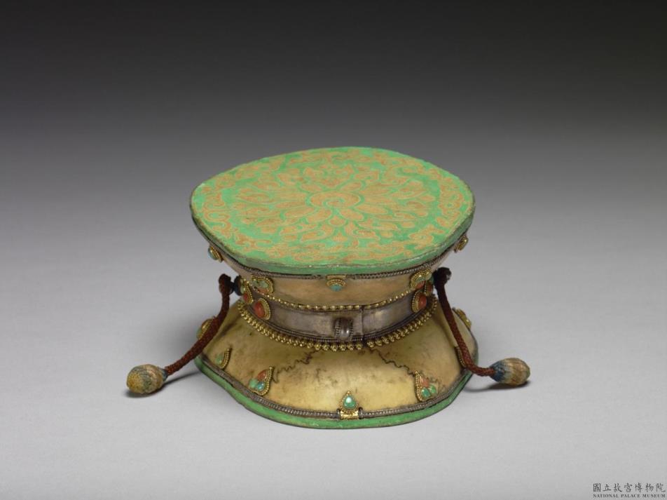 嘎布拉鼓,以头盖骨各一,相背黏合而成腰鼓形,中央接合处箍围镀金圈,已呈银灰色,上有活环,可接饰坠角、坠饰,金属圈上镶珊瑚、松绿石。鼓面兽皮绿漆地,描金莲花盛开,周围卷草。鼓缘亦镶珊瑚、松绿石为饰。鼓为修密宗作法时驱魔之乐器。带木胎皮盒。