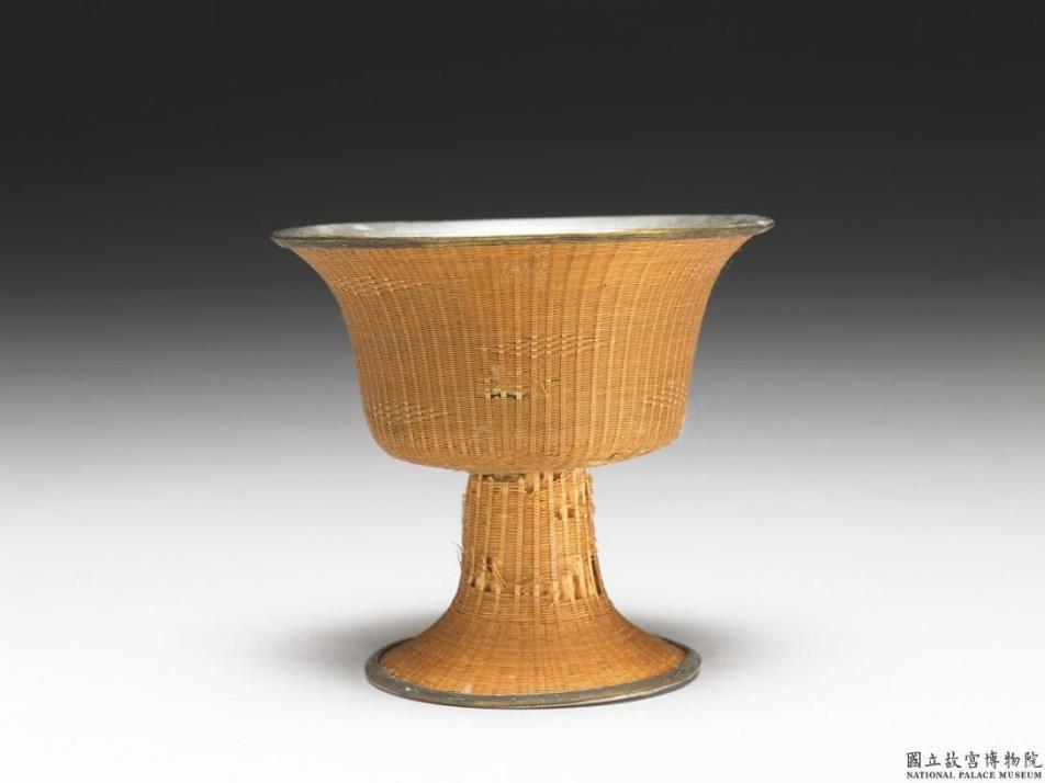 高足杯,撇口,深直壁,足外撇。器里以锡为胎骨,外壁编附竹片,并于口沿处与足缘处用铜扣一圈将两种材质密接,使外表看起来整器有如竹编而成。平底,底外露锡胎,中央有凹痕一圈。