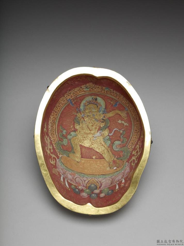 清宫装饰,十八世纪。颅骨碗,镶银镀金、嵌松石珊瑚边饰。碗内红地彩绘,口缘描金书然札体藏式梵文经咒一周;中央为双修财神像:主尊三眼、戴五叶冠、左手胸前捧银鼠、右手持十字金刚钺杖;拥抱佛母,佛母右足斜立、左足绕主尊腰上、右手托宝罐。二尊皆赤身披金璎络衣,站莲座上,座前并供象牙、如意珠、方胜等诸宝。背光作卷草图案。从图绘笔触看,是清宫画匠所绘。