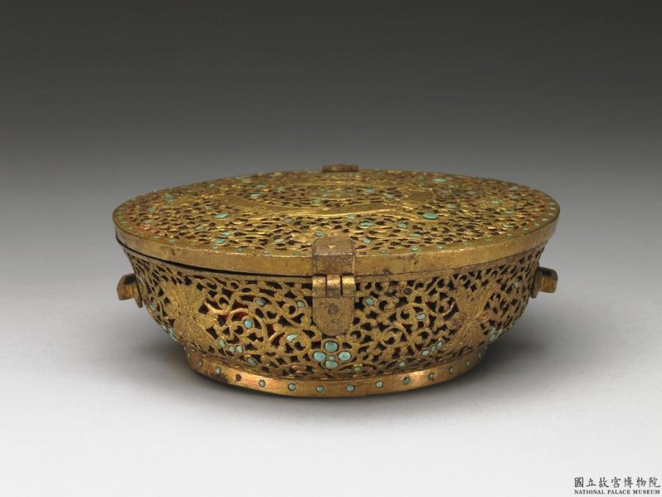 铁镀金盒,内贮藏人随身携带的札古札雅木碗。盒身作碗形,具足形而平底;盖面平,以合叶及圆穿与器身相扣合,扣合处可穿系;又盒身两侧二方形穿孔,应是为了藏人生活中,将碗揣入怀中的习惯而设。全盒均镂空花纹,并镀金镶松石,而器里衬红绒,益显鲜艳。盒壁及底以细密卷枝番莲为主纹,盖饰正面穿花龙纹。