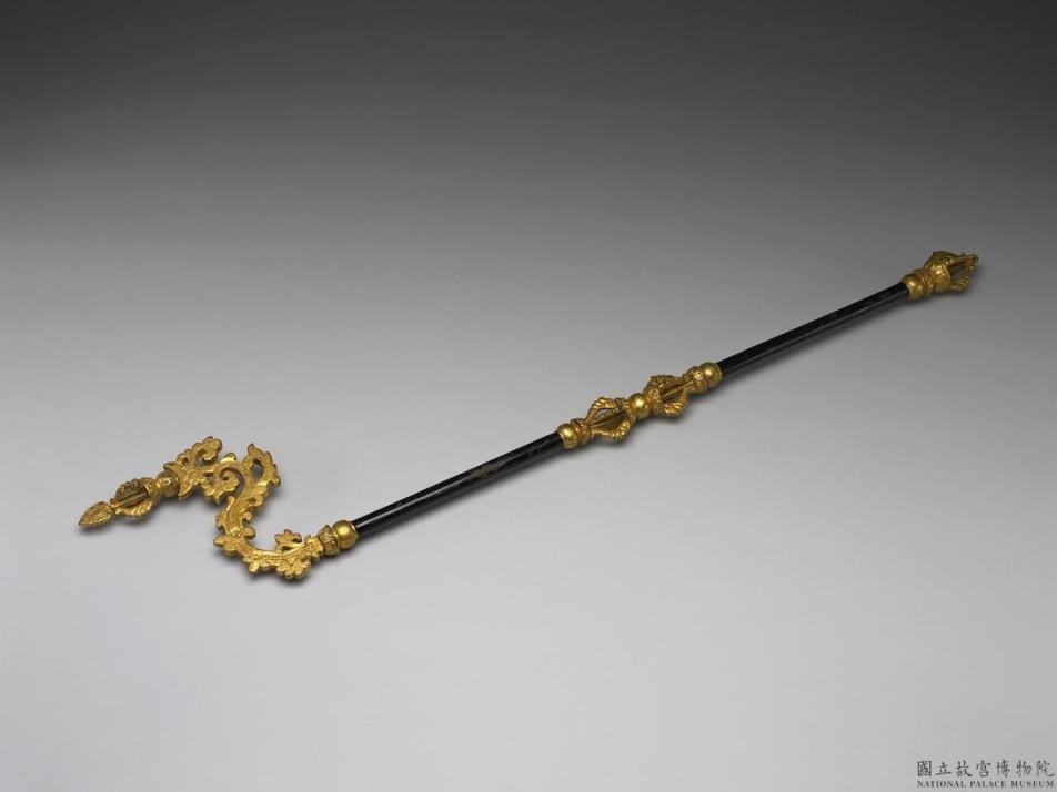清宫作品,十八世纪。长柄幡杖,铁质,杖柄髹黑,以鎏金杵箍束装饰;杖首曲弯作夔凤式,应是仪杖前导者的手持物。