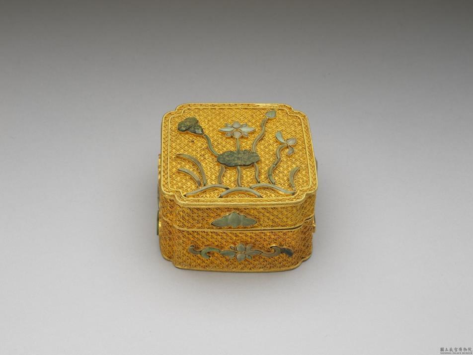 盒呈四方形,四角略向内凹成花瓣形。全器镀金,满布古钱纹,边饰云头纹,盖面及四周皆加嵌绿色石荷花。