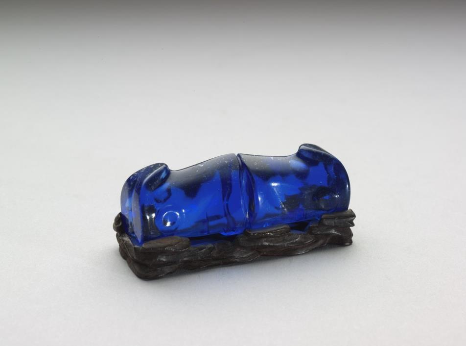 清宫档案记录显示,雍正乾隆时期内务府造办处玻璃作坊曾承旨制作多种不同式样的玻璃笔架,包括双桃、如意,与源自满族游艺风习的兽骨形式等。传世文物所见此类玻璃小型文房具大多为两端高,中央微凹,可供搁笔。色彩有黄、青、蓝、豆绿等,并有透明与不透明之别。