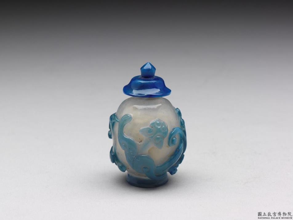 乳白色半透明玻璃罐,上套蓝色玻璃刻蟠螭盘绕,带蓝色玻璃宝顶盖。