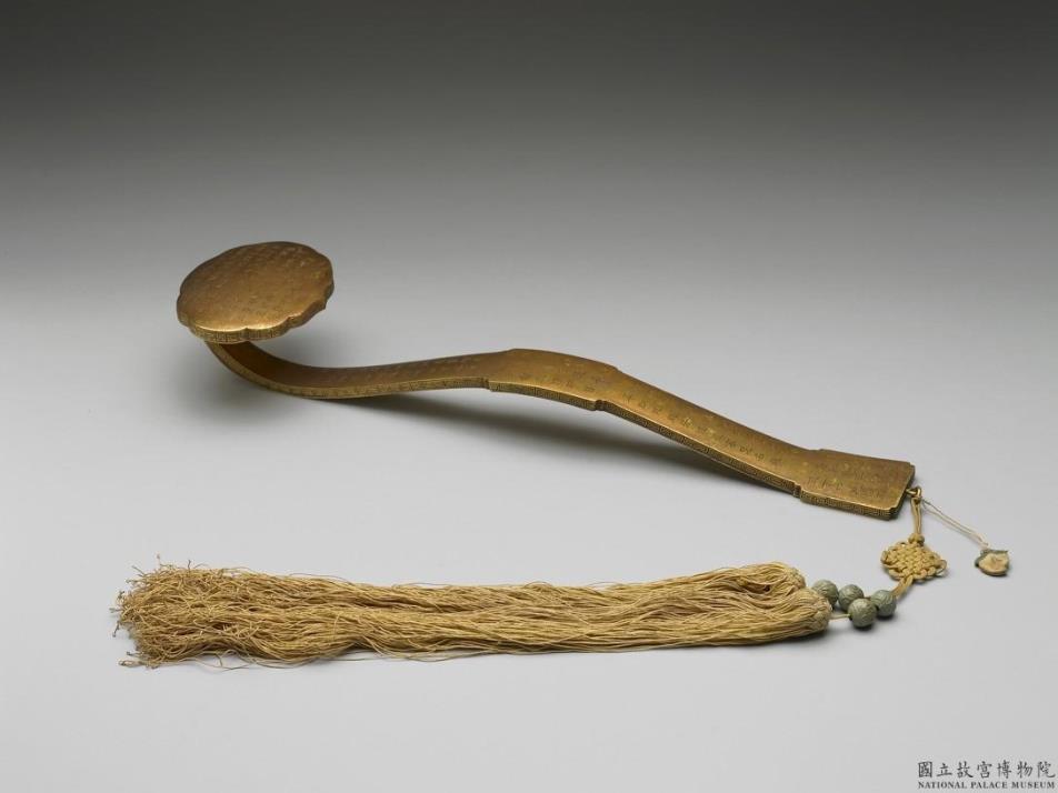 清宫作品,十八世纪。铜镀金如意,云叶式首、柄中央隆起,腹与趾均作长方,系双穗。全器除边侧饰回纹外,首与柄之表面与底面,均满刻汉字隶书之经文。类似的如意,本院共藏六柄,经文各不同,本柄有「分十二」、「分十三」字样,穗上亦系桃形小香绊,书「辰」字。「如意」的器名,已见于五世纪初的佛经《四分律》中,其造型也见于佛教雕刻上,是六朝至隋唐的文士、僧侣常用的手持物。但宋元以后一般佛教人士甚少言及如意,却成为文房雅玩之一,也是清代君臣逢年节庆贺吉祥如意的用物。清廷曾以如意赏赐蒙藏人士,此件如意满刻佛经,且似多量制作,或亦供赠赉为佛前供器。