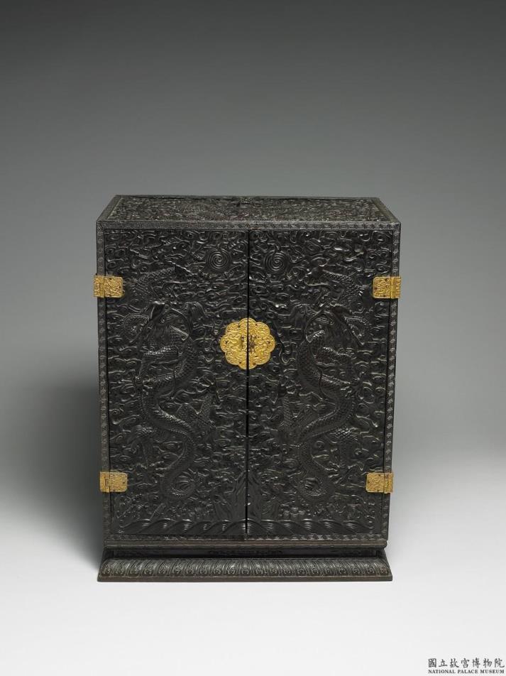 紫檀满雕龙纹小柜,里面以楠木与紫檀木运用制作,共分成十一个小屉,除三个八景图册页屉外,其余则各屉则装入各种古玩。在小屉的有限空间中,除上下屉交错使用外,也有侧面暗屉,甚至是整匣可提出、四面拉开的小格子。空间变化活泼,内部古玩都搭配造型各异的木座。此外,为了让古玩在屉中稳妥,更用月白绫锦垫,配合文物露出形状,做成一屉屉的保护垫,除了柜体做工精细,装配别出心裁,同时也提供了乾隆时期文物保护的最佳范例。