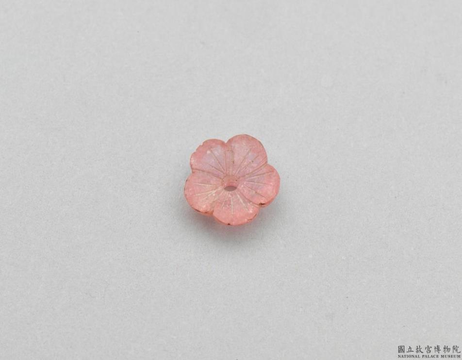 碧玺雕刻而成之五瓣梅花一朵,中心有一穿孔,小巧可爱。故杂1988至故杂2069共捌拾贰件装成一包,色泽为深浅不一的粉红色,呈半透明,可见矿石内部天然结晶纹理。