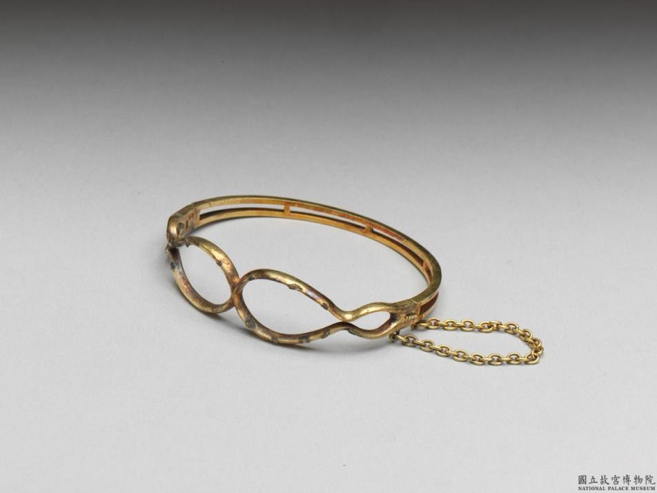 镀金手镯,全器外型略近于眼镜,其显眼而近椭圆并连的造型有如镜框,并榫接拗弯为半弧形的镂空长格金属条,有如将镜架拉直接连成一体,也使得整器成为环形手镯,相当具设计感。