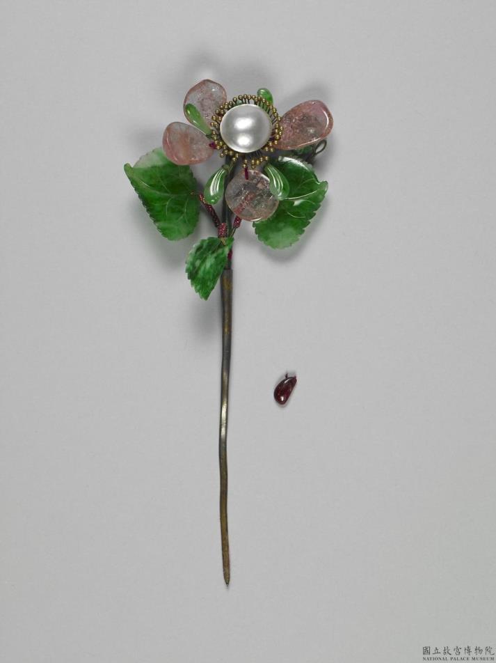 花叶簪,簪首为茶花,花瓣与花蒂分别以半透明粉红碧玺与翠绿翡翠雕成,以珍珠作花芯,色白,嵌于珠花座上;叶片位于茶花下方,叶片可见叶脉与锯齿缘。