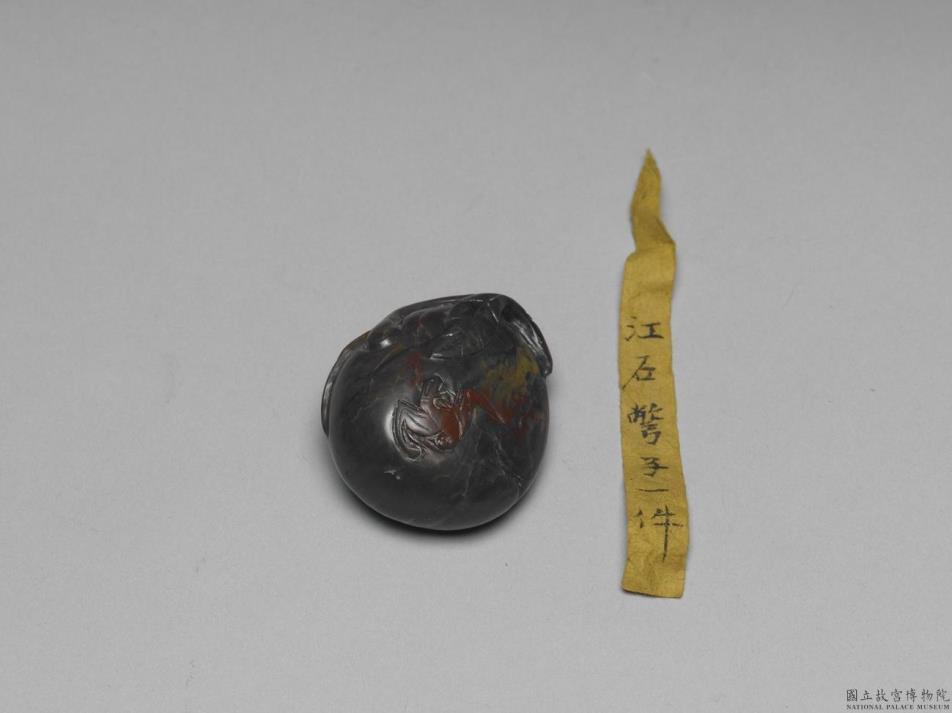 此为蟠桃形坠,上有刻浅浮桃叶的纹路和蝙蝠,蝙蝠和寿桃皆为吉祥福寿的象征。