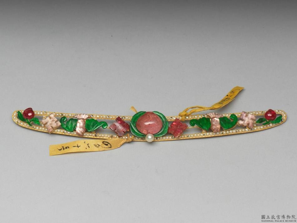 钿花,主体为长条形金属座,上嵌饰各色玉石与碧玺,边廓则镶珍珠。金属座中央为寿桃一颗,两侧依次对称饰卍字、蝙蝠、桃子,红绿相间,既富贵又悦目。