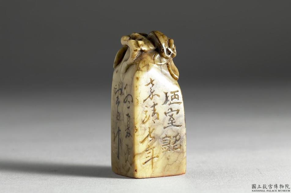 石章,印面正方,色乳黄带黑色裂纹。全套共十二件,为集刻刘禹锡〈陋室铭〉。本件阴刻「山不在高有仙则名」。边款「山不在高有仙则名。陋室铭,嘉靖七年。孟夏既望日作。文氏寿承」。印钮作立雕连枝佛手一株。作者传为明代书篆大家文彭(1498-1573)。全套收于一木屉,附清乾隆〈铭篆兼珍〉印谱。