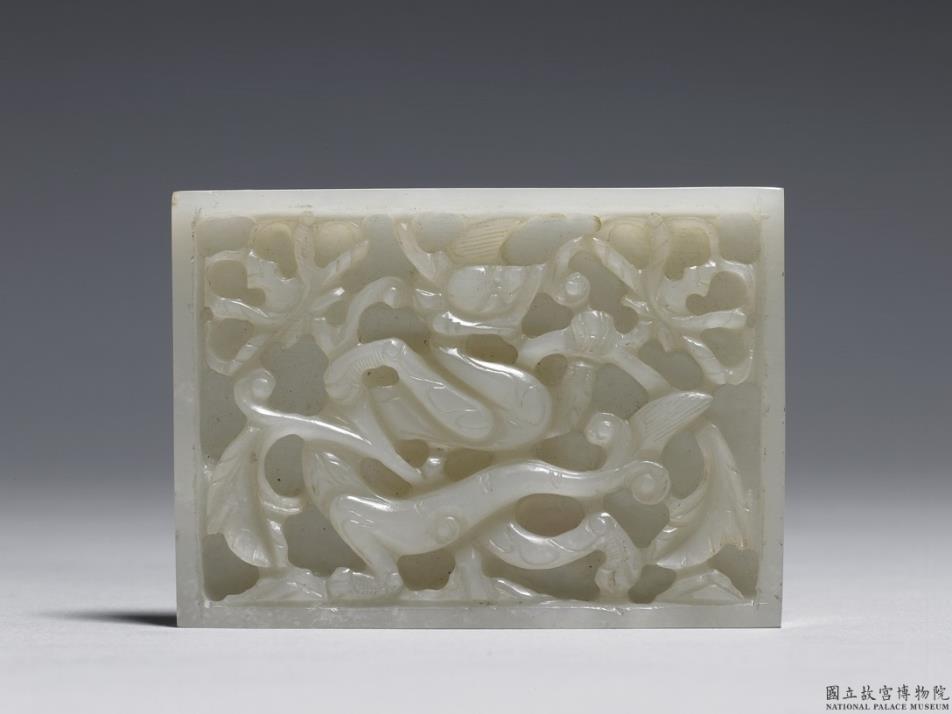 玉质。器作长方形,正面为双层镂雕之龙纹与花叶,龙前足抓着花茎,身躯穿梭于花丛中。背面有四象鼻穿。附卷草雕花木架。原为腰带上的装饰玉板,清代改作为书斋中摆设之用的插屏。