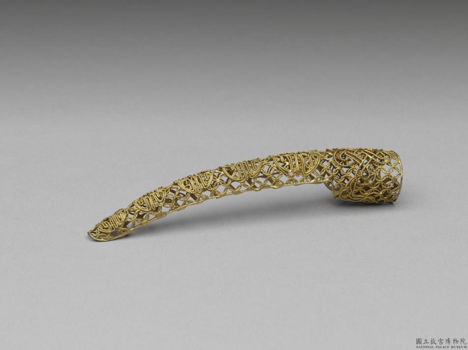 弓形,铜质镀金,整器纹饰以累丝技法表现,面部作古钱纹锦地,基底饰一盘长,两侧并延伸绶带纹,盘长以上连饰五个渐小团寿纹;背作镂空多格式,套部为面部延伸之两股交迭而成,套围可调整。此器与故杂3790为一对。