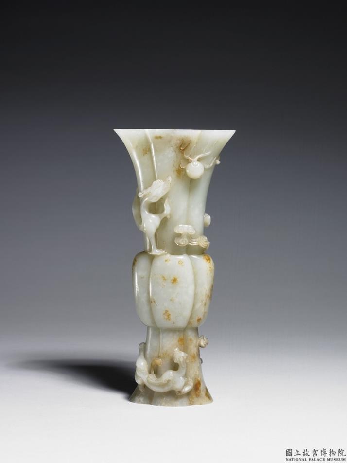 玉质,有绺,器表局部刻意作色。全器呈四瓣海棠花形,器作三段,脰部高浮雕龙戏珠,足部则饰螭兽,并间有卷云。