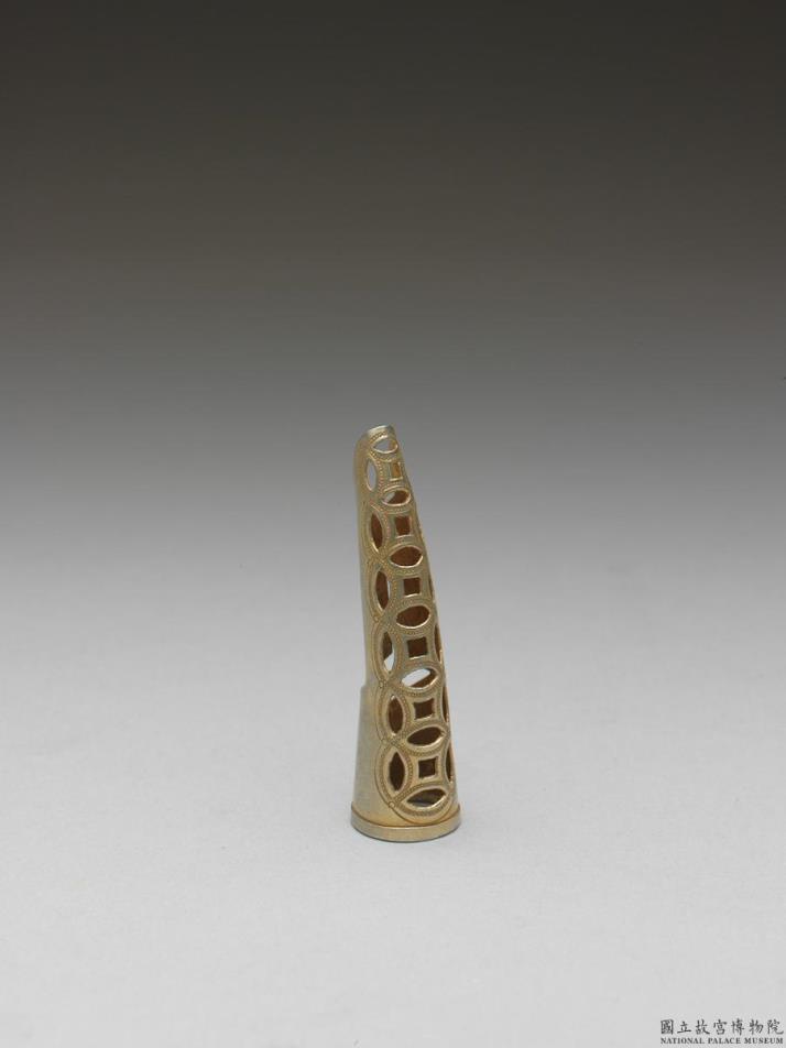 弓形,铜质鎏金,自基底至指尖渐细,面部共饰六个镂空相扣古钱纹,钱纹上并錾刻有鱼子纹,纹饰往指尖渐小,套面铜片延伸至背部包合,使套围大小可调整。此器与故杂3912为一对。