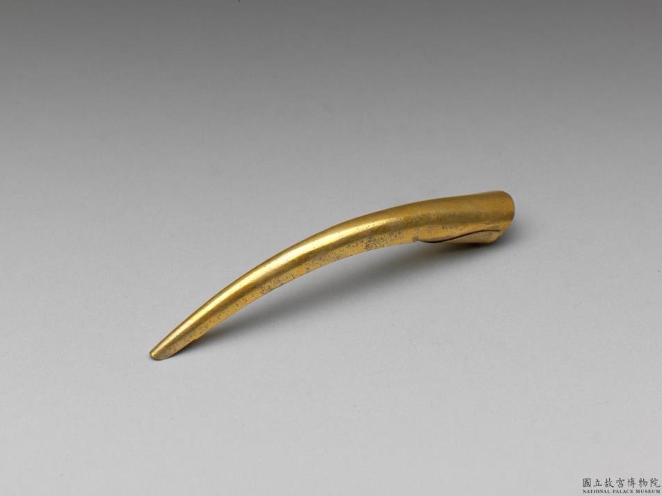 弓形,从基部到指尖渐渐变细,素面,背部作空格式。此器与故杂3982为一对。