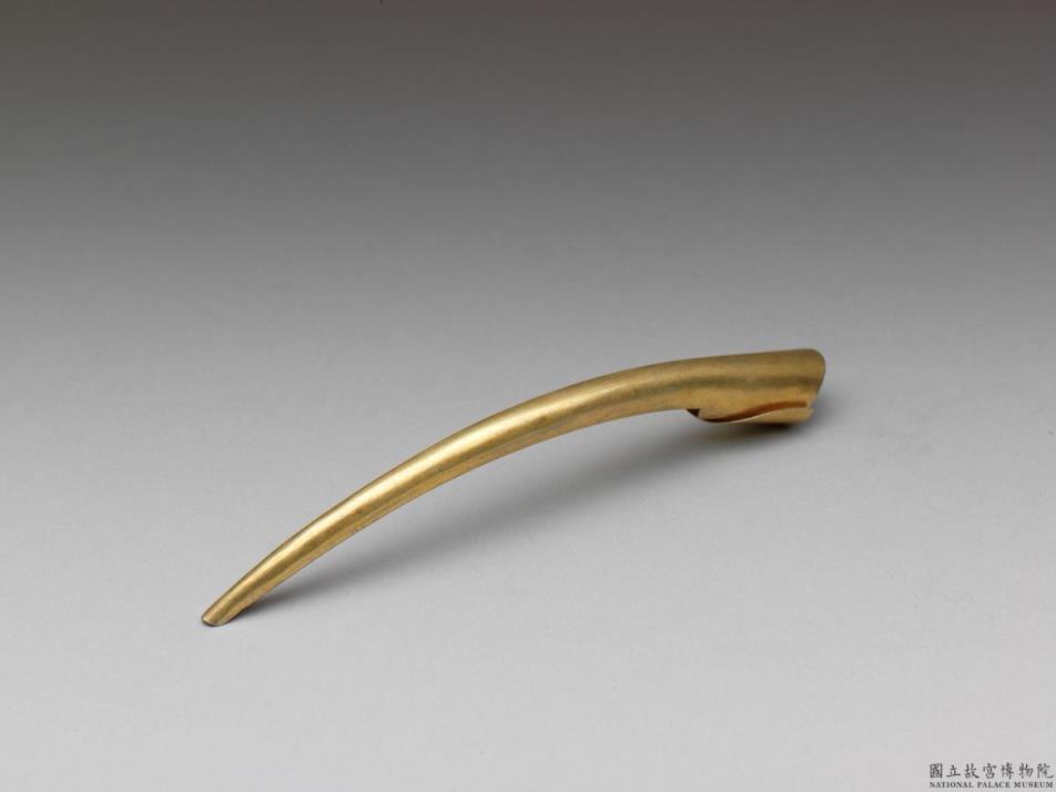 弓形,从基部到指尖渐渐变细,素面,背部作空格式。此器与故杂3984为一对。