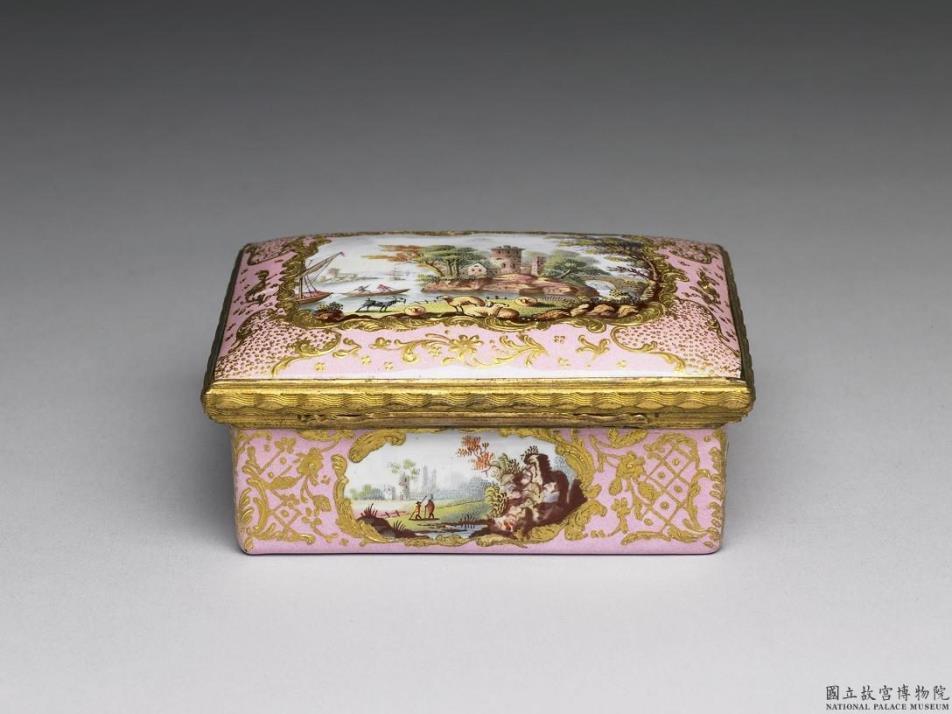 铜胎画珐琅掀盖盒二件(故玉3612与故玉3649附件),皆以粉红色地涡卷描金装饰,四周开光绘风景画,一件盒盖绘河岸风景画,另一件绘贵族男女漫步庭园中,口缘镶雕花镀金铜口。依其形制与装饰风格,应为十八世纪后半英国Battersea式珐琅。