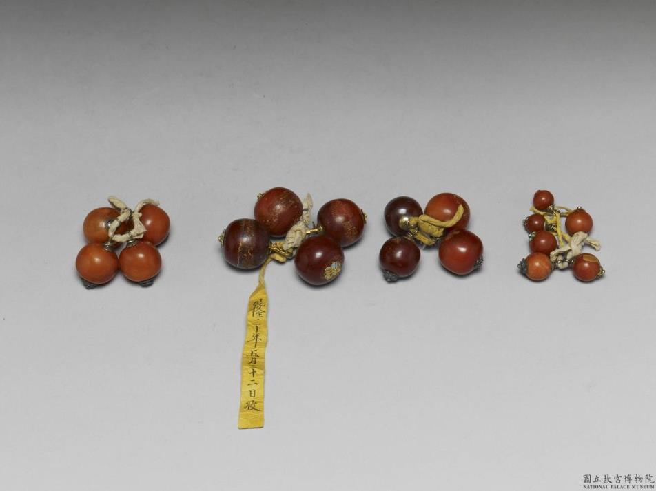 蜜腊钮子,钮身呈球形、浑圆光滑;色泽大致呈暗红色,深浅不一,表面隐约可见蜜腊纹理。钮顶接小圆钮环,底为单层花瓣点翠。
