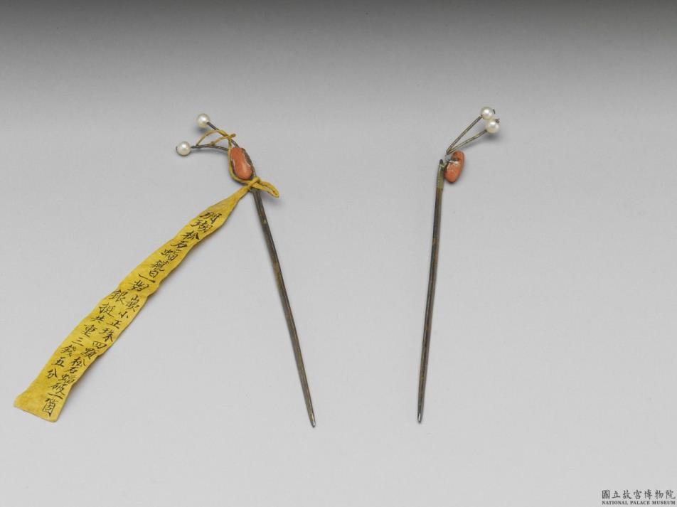 银素挺簪一对,两支形制相同。器身细长,簪首饰以红珊瑚松石蝙蝠一只。珊瑚蝠身中央有一横穿孔、松石蝠翼靠近身体处各有二小穿孔,供金属线穿过使其合为一体、并固定于簪首处;蝠身上方金属线分为两股作触须,每股末端各穿有一小珍珠。