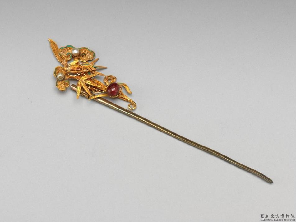 累丝金簪,簪首为累丝灵芝二朵,嵌有珍珠与红色宝石,其上串饰点翠竹叶数片,铤素直,铤背有「天祥」戳记一方。此器与故杂4717为一对。