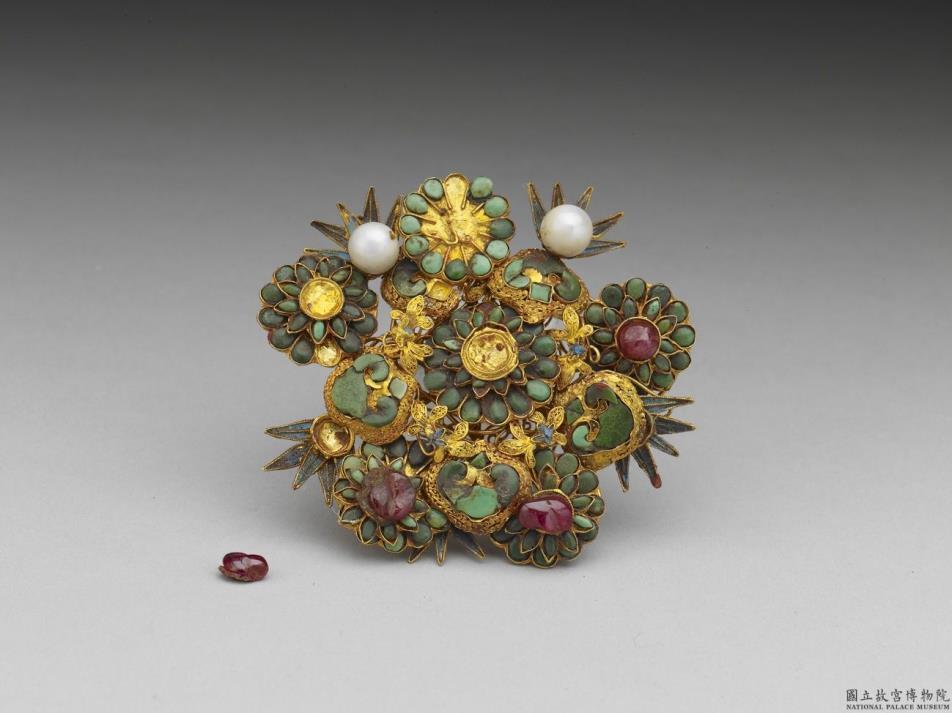 金面簪,呈不规则形,主纹饰为由六朵双重瓣花卉,瓣嵌绿松石,花芯嵌红色宝石,花间饰有点翠嵌珍珠竹叶与累丝云头纹。