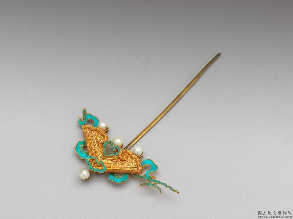 尖首素铤簪,簪首作累丝磬,作工精细,主题明确。四周除了点缀满饰点翠的云气与戟外,还装饰了数颗珍珠,既映衬出累丝磬这一装饰主体,也增添了整体的富贵与吉祥意涵。院藏故杂4842~4843为一对。