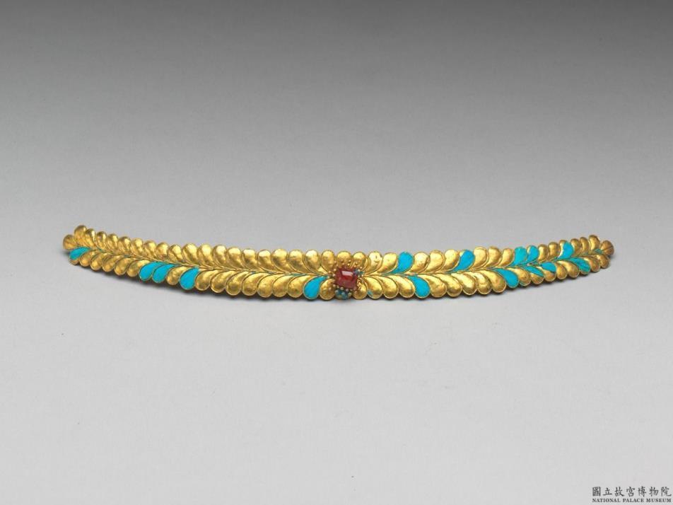 银镀金点翠条,全器呈长条片状,略弧,器表琢为排列紧密整齐的两层鳞状叶片,其上满饰点翠,有如具有毛茸茸纹理叶片,翠条正中央金属蕊条略内收,紧紧围绕、扣合镶嵌于上红宝石,万「翠」丛中一点红,非常亮眼。